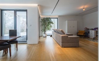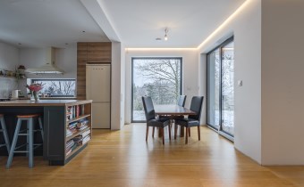 Duże przeszklenia zostały zaprojektowane tak, aby wpuścić otaczający krajobraz do wnętrza. Salon staje się przedłużeniem natury.